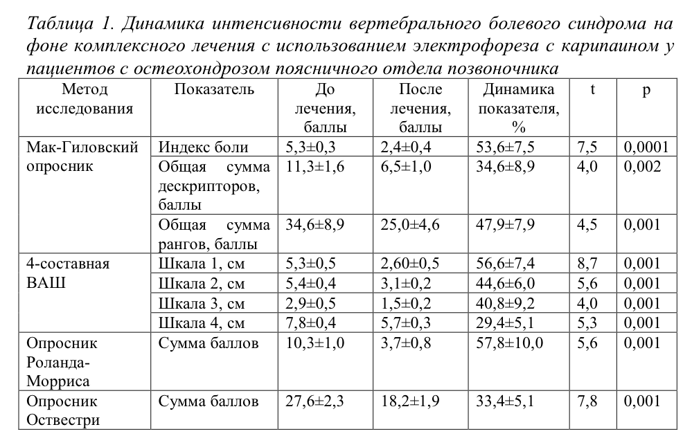 Эффективность комплексного лечения вертебрального болевого синдрома с применением электрофореза с карипаином у больных с остеохондрозом пояснично-крестцового отдела позвоночника