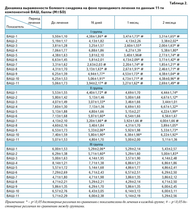 Уровень боли на момент опроса (ВАШ-1) достоверно снизился в І группе по окончанию курса лечения (t=3,00, р=0,009). Эффект проведенной терапии удерживался на протяжении периода наблюдения через 1 (t=5,29, р<0,001) и 2 месяца (t=5,42, р<0,001). Во ІІ группе достоверное снижение боли на момент опроса наблю- далось по окончанию курса лечения (t=2,91, р=0,05) и через два месяца наблюдения (t=3,04, р=0,02), в то время как в группе сравнения – только по окончанию курса лечения (t=2,5, р=0,05). По окончанию курса лечения (16 дней) уровень боли на момент опроса был достоверно ниже в І (F=1,31; р=0,02) и ІІ (F=1,02; р=0,03) группах по сравнению с таковым показателем в ІІІ группе и не отличался между группами, применяв- шими Гиалгель. На протяжении периода наблюдения установлено достоверно ниже выраженность боли через 1 (F=1,53; р=0,05) и 2 (F=2,42; р=0,04) месяца в І группе по сравнению с показателем в ІІІ группе. Динамика по- казателя ВАШ-1 по отношению к исходному показателю составила по окончанию периода лечения и наблюдения соответственно для І группы 21,5% и 39,7%, для ІІ груп- пы – 15,5% и 24,5%, для ІІІ группы – 14,6% и 13,3%.Средний (типичный) уровень боли (ВАШ-2) до- стоверно снизился через 16 дней терапии в І (t=2,87, р=0,01) и ІІІ (t=2,83, р=0,03) группах. Через 1 месяц не установлено достоверного снижения данного показателя ни в одной из групп. Через 2 месяца периода наблюдения боль по ВАШ-2 оказалась достоверно ниже по сравне- нию с показателями до лечения во всех исследуемых группах (І гр. – t=3,03; р=0,01; ІІ гр. – t=2,63; р=0,03; ІІІ гр. – t=2,46; р=0,05). Не установлено достоверных различий по данному показателю между группами на протяжении всего периода исследования. Динамика по- казателя ВАШ-2 по отношению к исходному показателю составила по окончанию периода лечения и наблюде- ния соответственно для І группы 21,3% и 33,1%, для ІІ группы – 6,6% и 18,2%, для ІІІ группы – 10,2% и 21,4%.Минимальный уровень боли (в наилучшие периоды болезни, ВАШ-3) через 16 дней достоверно снизился только во ІІ группе (t=2,56, р=0,02). В І группе этот показатель достоверно ниже по сравнению с показа- телем до лечения в период наблюдения через 1 (t=2,83, р=0,03) и 2 (t=2,83, р=0,03) месяца. В ІІІ группе не установлено достоверной динамики на протяжении всего исследования. В группе, применявшей только Гиалгель, достоверные различия по данному показате- лю установлены только через 2 месяца наблюдения по сравнению со II (F=2,59; р=0,03) и ІІІ (F=2,3; р=0,03) группами. Динамика показателя ВАШ-3 по отношению к исходному показателю составила по окончанию пери- ода лечения и наблюдения соответственно для І группы 12,5% и 40,3%, для ІІ группы – 18,9% и 7,7%, для ІІІ группы – 19,6% и 23,2%.Максимальный уровень боли (боль в наихудшие периоды болезни, ВАШ-4) был достоверно ниже по сравнению с показателем до лечения в І (t=3,5, р=0,004) и ІІ (t=2,48, р=0,04) группах только через 2 месяца, хотя по результатам сравнительного анализа влияния терапии на данный показатель между группами не установлено достоверных различий. Динамика показателя ВАШ-4 по отношению к исходному показателю составила по окон- чанию периода лечения и наблюдения соответственно для І группы 1,6% и 22,6%, для ІІ группы – 5,4% и 14,5%, для ІІІ группы – 4,8% и 13,7%.Уровень стартовой боли (ВАШ-5) достоверно сни- зился по сравнению с показателями до лечения в I (t=2,46, р=0,03) и ІІ (t=2,4, р=0,04) группах через 2 ме- сяца, однако только в І группе был достоверно ниже по сравнению со ІІ группой через 1 (F=1,34; р=0,04) месяц и с ІІІ группой через 2 (F=