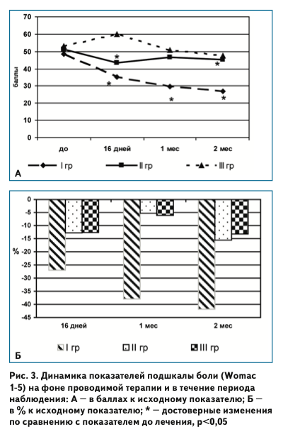 Коленные суставы являются самыми крупными суставами скелета, на которые приходится наибольшая нагрузка, поэтому болевой синдром при остеоартрозе данных суставов наиболее многогранен и может прояв- ляться с различной выраженностью (интенсивностью) как в покое, так и при физической нагрузке. По резуль- татам изучения особенностей изменения выраженности болевого синдрома при различных статико-динамичес- ких условиях на фоне проводимого лечения установлены достоверные различия между группами в эффективнос- ти терапии (табл. 2).