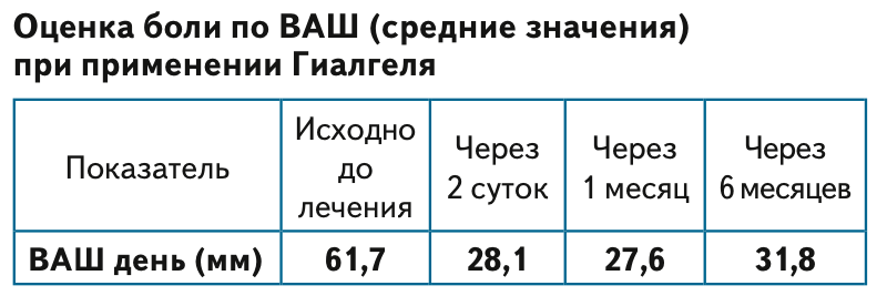 Одна из оценок эффективности терапии Гиалгелем ОА коленных суставов проводилась по ВАШ непосредс- твенно сразу по окончанию 2-го курса терапии, через 1 и 6 месяцев соответственно.