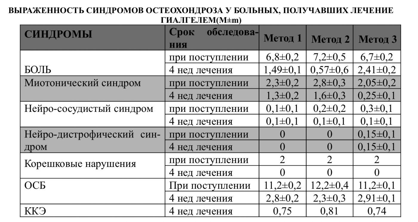 Таким образом, эффективность лечения дорсопатий по степени снижения клинической симптоматики оказалась достоверно выше при использовании «Гиалгеля», чем в группе плацебо.